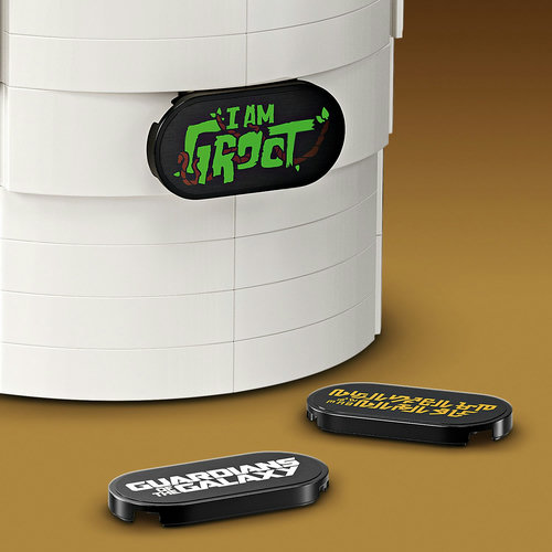 - Tańczący superbohater — zestaw zawiera Groota do zbudowania w doniczce, trzy różne tabliczki z napisami do przymocowania do doniczki oraz akcesoria, w tym słuchawki, okulary przeciwsłoneczne i dodatkowe liście