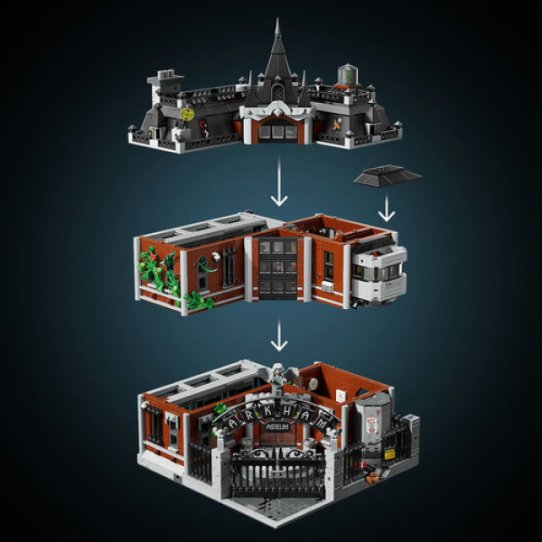 W modułowym zestawie konstrukcyjnym znajduje się 16 minifigurek LEGO: Batman, Batwoman™, Batwing™, Robin™, Mr. Freeze™, Człowiek-Zagadka™, Trujący Bluszcz™, Kobieta-Kot™, Scarecrow™, Harley Quinn™, Bane™, Joker™, Pingwin™, Killer Croc™ i dwóch strażników. Model dzieli się na trzy segmenty — pierwsze piętro, drugie piętro i dach — a odczepiane elementy umożliwiają dostęp do wnętrza. Dodatkowo w zestawie jest furgonetka dla więźniów, otwierane cele więzienne i 65 naklejek nawiązujących do historii Batmana. Każda sekcja jest podzielona na 24 torebki, dzięki czemu idealnie nadaje się do wykorzystania jako kalendarz adwentowy dla fanów Batmana.