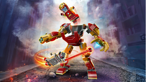 • Ruchomy mech Iron Mana — mech ma ruchome ręce, nogi i palce, a jego tułów otwiera się, odsłaniając kokpit, w którym można umieścić minifigurkę Iron Mana