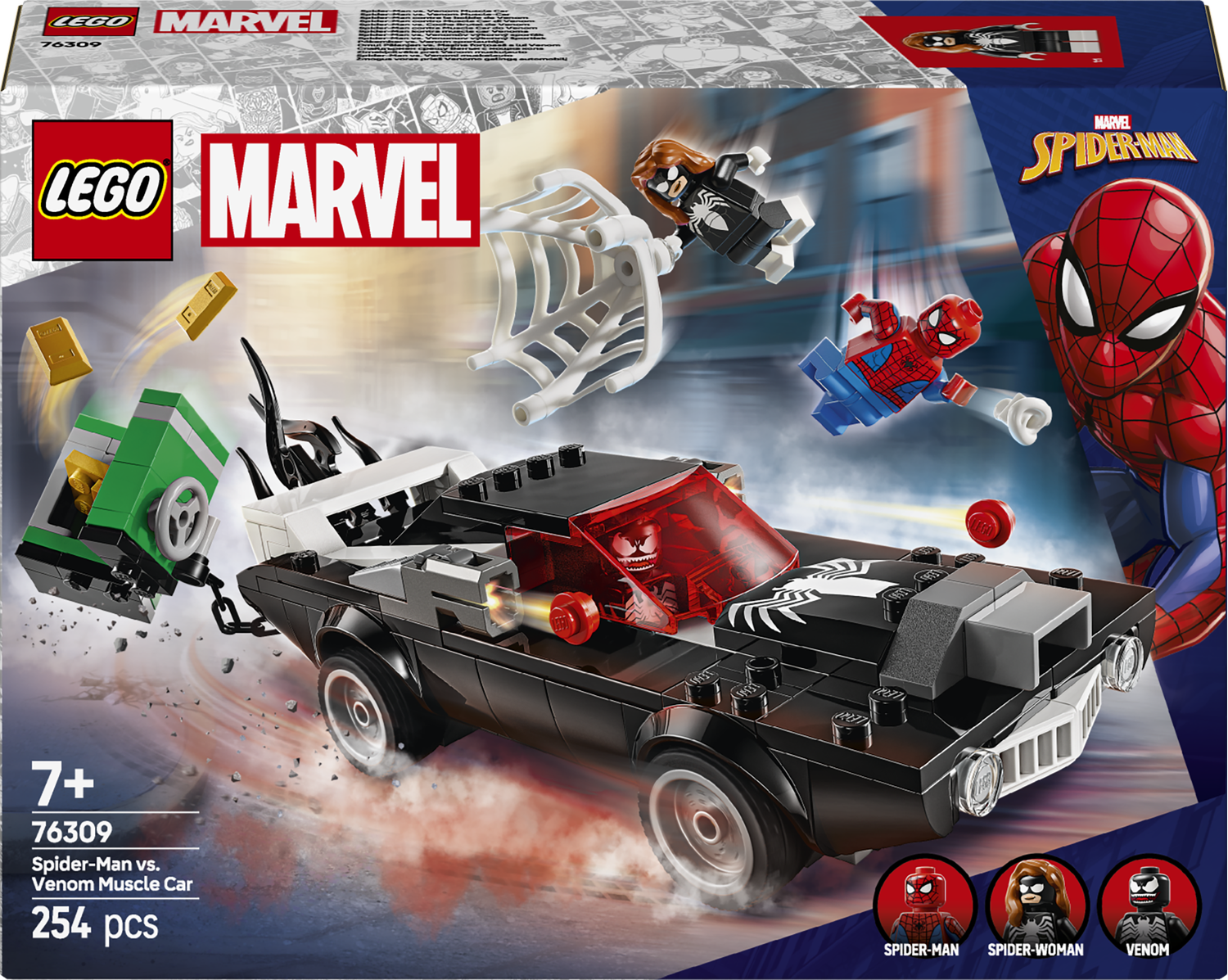 Auto dla dzieci do zbudowania zawiera trzy minifigurki LEGO Marvel: Spider-Mana z wyrzutnią pajęczyn, Venoma z czterema mackami i Spider-Woman (Julię Carpenter) z elastyczną pajęczyną, w którą można złapać złoczyńcę. Samochód LEGO dla 7-latka ma wyrzutnie, widoczny silnik i otwierany kokpit. Venoma można usadzić w samochodzie, odczepiając dwie dolne macki, którymi później można ozdobić pojazd. Sejf ze sztabkami złota w tym zestawie konstrukcyjnym inspiruje do odgrywania ról podczas zabawy w bohaterów i złoczyńców. Dodatkową cyfrową zabawę zapewnia intuicyjna aplikacja LEGO Builder, w której można obracać modele w 3D i śledzić swoje postępy.