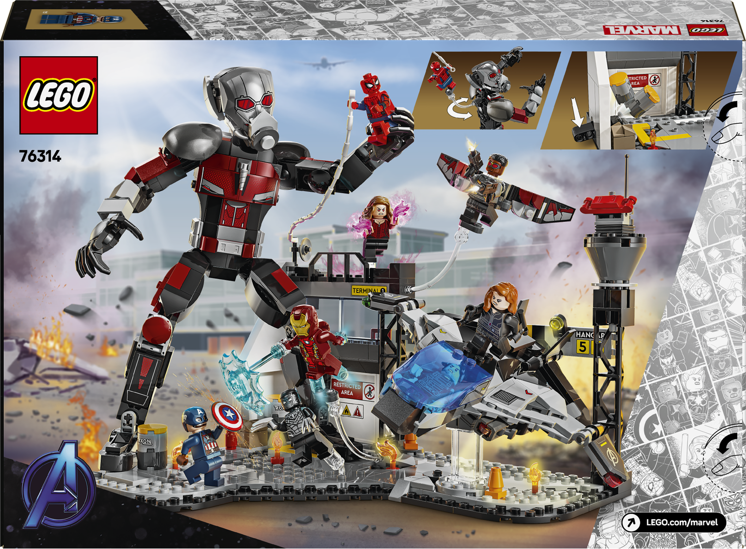 Ta zabawka konstrukcyjna dla 10-latka jest oparta na scenie bitwy na lotnisku z filmu Kapitan Ameryka: Wojna bohaterów Marvel Studios. Zawiera osiem figurek — Kapitana Amerykę, Zimowego Żołnierza, Wandę, Falcona, Iron Mana, Spider-Mana, Czarną Wdowę i Czarną Panterę — z bronią i akcesoriami, a także w pełni ruchomą figurkę Ant-Mana o wysokości 24 cm. LEGO Samolot Quinjet ma składane skrzydła i otwierany kokpit, w którym mieści się minifigurka pilota. Akcję urozmaica dodatkowo funkcja wybuchającej beczki wbudowana w scenerię lotniska. Dzieci mogą przybliżać i obracać model podczas budowania za pomocą cyfrowej aplikacji LEGO Builder.