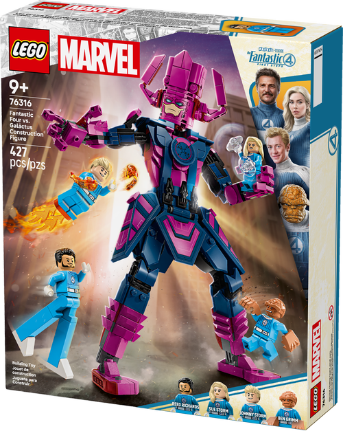 Zestaw zawiera cztery unikalne minifigurki: Pana Fantastica z rozciągliwymi nogami, Ludzką Pochodnię z miotaczami płomieni i przezroczystą podstawką imitującą latanie, Niewidzialną Kobietę z polami siłowymi oraz Stwora z potężnymi dłońmi. Do tego dochodzi imponująca, w pełni ruchoma figurka legendarnego Galactusa, mierząca aż 28 cm wysokości. Jej detaliczne wykonanie i ruchome elementy pozwalają na dynamiczne odgrywanie bitew i spektakularne ekspozycje.