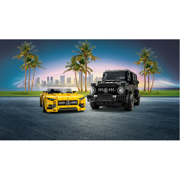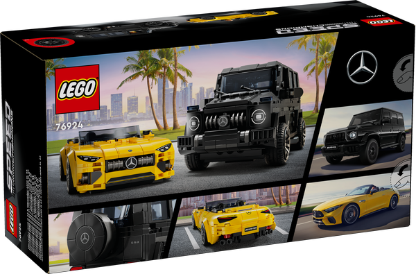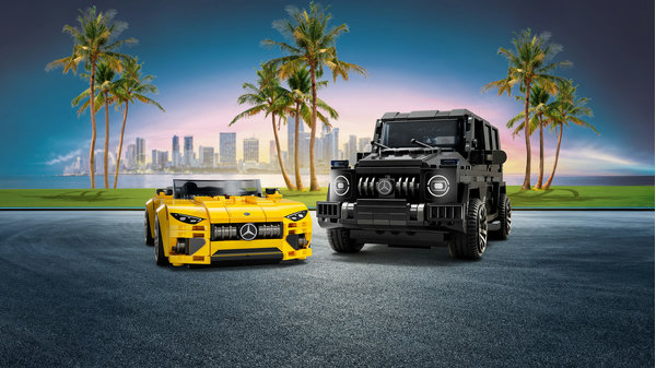 Modele czarnego SUV-a Mercedes AMG G 63 i żółtego kabrioletu AMG SL 63 zawierają autentyczne detale nawiązujące do pierwowzorów, w tym przednie grille, maski, elementy wnętrza i rozpoznawalną kolorystykę Mercedesa. Do każdej zabawki dołączona jest także minifigurka kierowcy, którą dzieci mogą umieścić za kierownicą i bawić się w wyścigi.