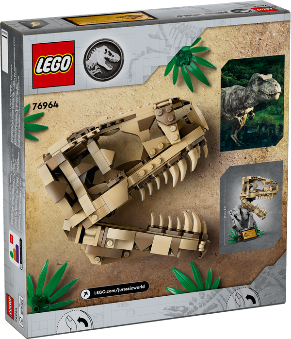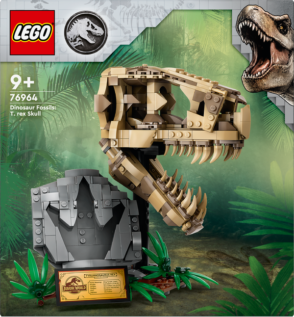 Zainspiruj dzieci w wieku od dziewięciu lat lub początkującego paleontologa zestawem LEGO® Jurassic World Szkielety dinozaurów — czaszka tyranozaura (76964). Pierwszy zestaw Jurassic World stworzony do ustawienia na półce składa się z czaszki z otwieraną szczęką, podstawki z tabliczką informacyjną, ukrytego „bursztynu” z tyłu modelu oraz „skamieniałego” odcisku stopy.