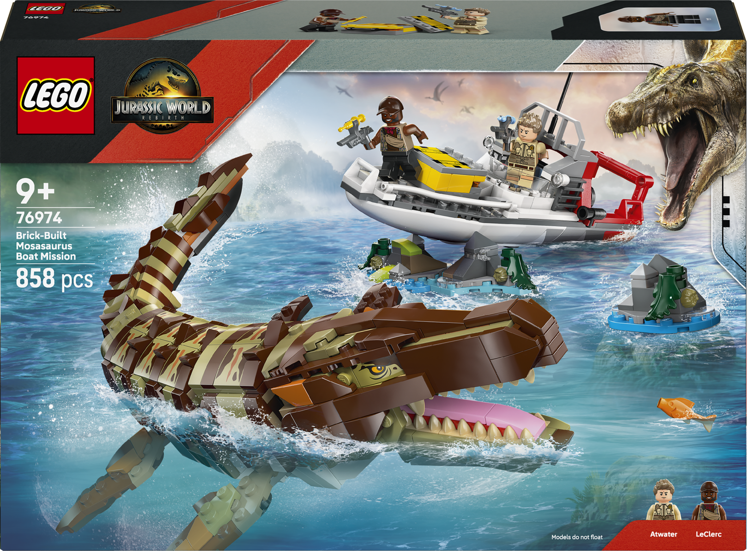 W zestawie klocków LEGO Jurassic World Misja na łodzi i model mozazaura (76974) na dzieci i fanów przygód w wieku od dziewięciu lat czekają historie ze świata dinozaurów. Zabawka dla dzieci zawiera w pełni ruchomy model dinozaura — mozazaura z ruchomymi płetwami, ogonem i otwieranym pyskiem, minifigurki LeClerca i Atwater, a także zabawkową łódź i akcesoria, takie jak pojemnik na strzykawki i pięć strzykawek z próbkami. To fajna zabawka dla 9-latka oraz pomysł na prezent dla miłośników dinozaurów, dla chłopców i dziewczynek.