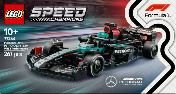 Dziesięciolatki i starsze dzieci mogą zbudować, ustawić na półce i bawić się w wyścigi tym niesamowitym pojazdem z zestawu LEGO® Speed Champions Bolid F1® Mercedes-AMG W15 (77244). Elegancki bolid dla dzieci i fanów zespołu Mercedes-AMG PETRONAS zawiera detale samochodu, który brał udział w wyścigach Formuły 1® w 2024 roku.